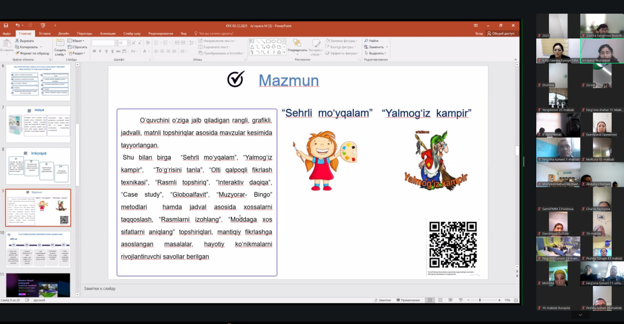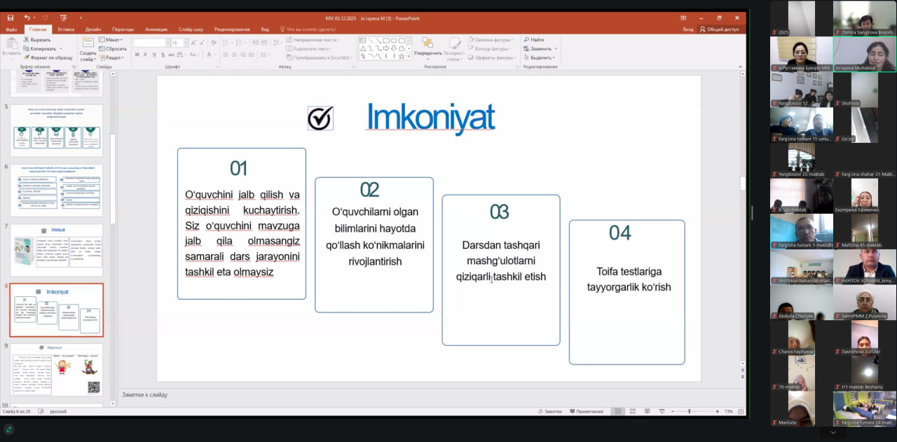 Joriy yilning 3-dekabr kuni Taʼlimni rivojlantirish respublika ilmiy-metodik markazi tomonidan tabiiy fanlar yo‘nalishi o‘qituvchilari uchun “Innovatsion ta’lim: hamkorlik va tajriba almashish” mavzusida onlayn uchrashuv tashkil etildi.