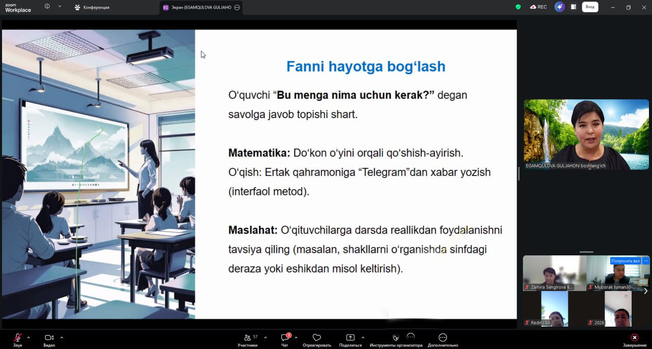 Erkin muloqot va faol bahs-munozaralar ruhida o‘tgan uchrashuvda Jizzax viloyati Forish tumanidagi 15-umumta’lim maktabi boshlang‘ich sinf o‘qituvchisi Guljahon Egamqulova “O‘quvchini darsga qiziqtirish sirlari”, “Nega o‘quvchi zerikadi?” kabi mavzular yuzasidan o‘z fikr va tajribalari bilan o‘rtoqlashdi.