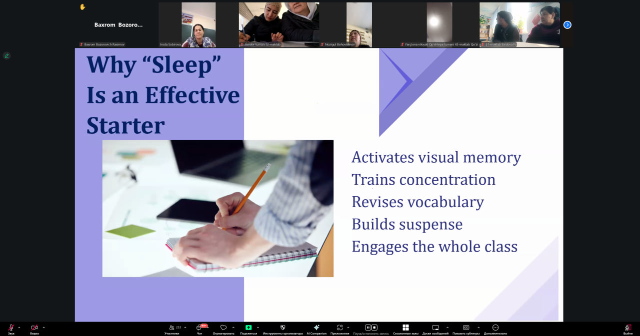 Mazkur tadbirda Xorazm viloyati Xiva shahridagi 9-son umumta’lim maktabining ingliz tili fani o‘qituvchisi Sobirova Iroda Abdullayevna tomonidan “Dars boshida o‘quvchilarni qanday jalb qilish va darsni qanday samarali yakunlash mumkin?” mavzusida taqdimot o‘tkazildi.