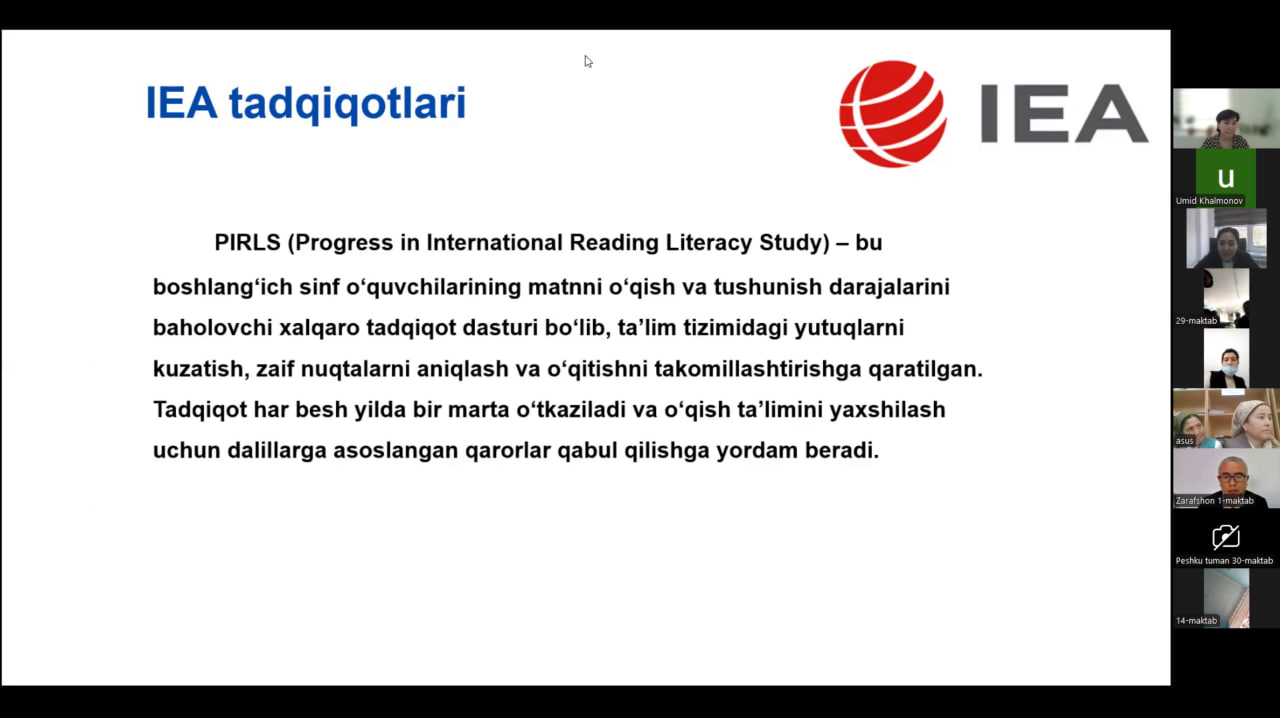 Joriy yilning 13-noyabr kuni Taʼlimni rivojlantirish respublika ilmiy-metodik markazi tomonidan “PIRLS xalqaro tadqiqotiga tayyorgarlik: oʻquvchilarning raqamli savodxonligini rivojlantirish” mavzusida onlayn Meet up tashkil etildi. Unda respublikaning turli hududlaridan 1 000 nafardan ortiq pedagoglar ishtirok etdi.